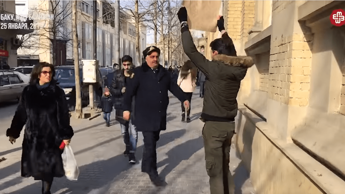 Во время акции Рафаэль Гусейнзаде держал плакат с лозунгами: "Свободу политзаключенным!" и "Долой Ильхама!". На плакате было фото президента Азербайджана Ильхама Алиева, над которым было написано: "Диктатор". Вскоре Гусейнзаде задержали полицейские. Когда активиста вели к полицейской машине, он стал кричать: "Видите, люди, видите это бесправие?" Акция транслировалась в прямом эфире Meydan.Tv.