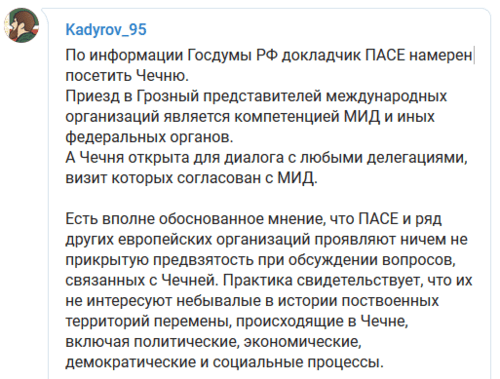 "Практика свидетельствует, что их не интересуют небывалые в истории поствоенных территорий перемены, происходящие в Чечне, включая политические, экономические, демократические и социальные процессы. О них знают во всем мире, но только не ПАСЕ... Есть все основания полагать, что они преднамеренно ставят перед собой цель очернить Чечню, а вслед за ней всю Россию. Видимо, хотят, чтобы мы утратили свои духовные и национальные ценности, растворились в массе тех, кто забыли свои языки, религию, культуру", - написал 19 сентября глава Чечни в своем Telegram-канале.