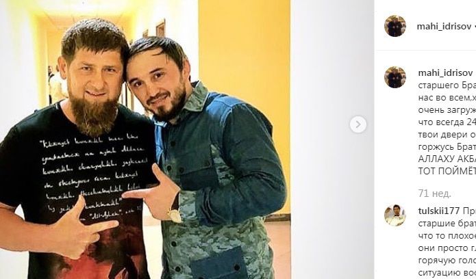 На странице Махи Идрисова в Instagram опубликован целый ряд фото, из которых следует, что он состоит в дружеских отношениях с главой Чечни Рамзаном Кадыровым. Так, на фотографиях, опубликованных 14 мая 2018 года, Кадыров и Идрисов сидят рядом на корточках в спортзале, на другой - стоят обнявшись. 20 сентября замглавы МВД Чечни Апти Алаудинов разместил на своей странице в Instagram совместное фото с Рамзаном Кадыровым и Махи Идрисовым, заявив о "временных проблемах" "брата".