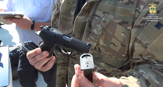 На оперативной записи МВД, сделанной на месте инцидента, видна группа силовиков и людей в гражданской одежде. Силовики осматривают спортивные сумки и мешки, выставленные на землю рядом с вагончиком. Лица всех людей размыты. "Граждан установленных я попрошу: вещи здесь, пять шагов", - говорит мужской голос на видео. Полицейские опрашивают людей, делают записи. Оперативник осматривает пистолет, пересчитывает патроны, затем оружие упаковывают в пластиковый пакет.