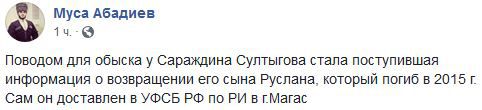 "Поводом для обыска у Сараждина Султыгова стала поступившая информация о возвращении его сына Руслана, который погиб в 2015 году", - написал Абадиев на своей странице в Facebook, уточнив, что Султыгов доставлен в Управление ФСБ в Магасе.
