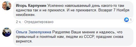 "Усиленно навязываемый день какого-то там единства так и не прижился. И не приживется", - написал Игорь Карпунин. "Разделяю ваше мнение и надеюсь, что привычный и понятный нам, людям из СССР, праздник снова вернется", - согласилась Ольга Залепухина.