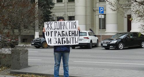 Дольщики ЖК «Династия» Марина Тесленко и Алексей Якунин сегодня с 10.00 до 11.00 (с 09.00 до 10.00 мск) поочередно провели у здания областной администрации одиночные пикеты с плакатом «ЖК Династия. Ограблены и забыты», передал присутствовавший на месте событий корреспондент "Кавказского узла".