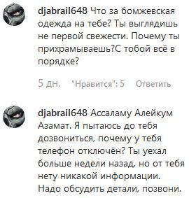В другом комментарии этот же пользователь призвал Азамата Ибрагимова выйти на связь. "Я пытаюсь до тебя дозвониться, почему у тебя телефон отключён? Ты уехал больше недели назад, но от тебя нету никакой информации", - написал он.