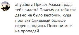 "Азамат, рада тебя видеть! Почему от тебя так давно не было весточки, куда пропал? Скидывай больше видео с родины. Позвони мне, не пропадай", - написала aliya.borz. "Я тоже не знала, что у тебя есть инста", - добавила она в другом комментарии.