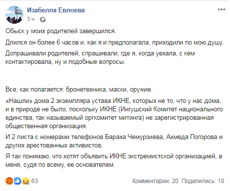 "Они предъявили постановление об обыске, но моя мама была без очков, и не смогла его прочесть. В рамках обыска изъяли всю технику, телефоны. Нашли два экземпляра устава Ингушского комитета национального единства (ИКНЕ) и два листа с номерами телефонов арестованных активистов. Ну как нашли — этого у нас дома раньше не было, но легко «нашлось» при обыске", - рассказала она.