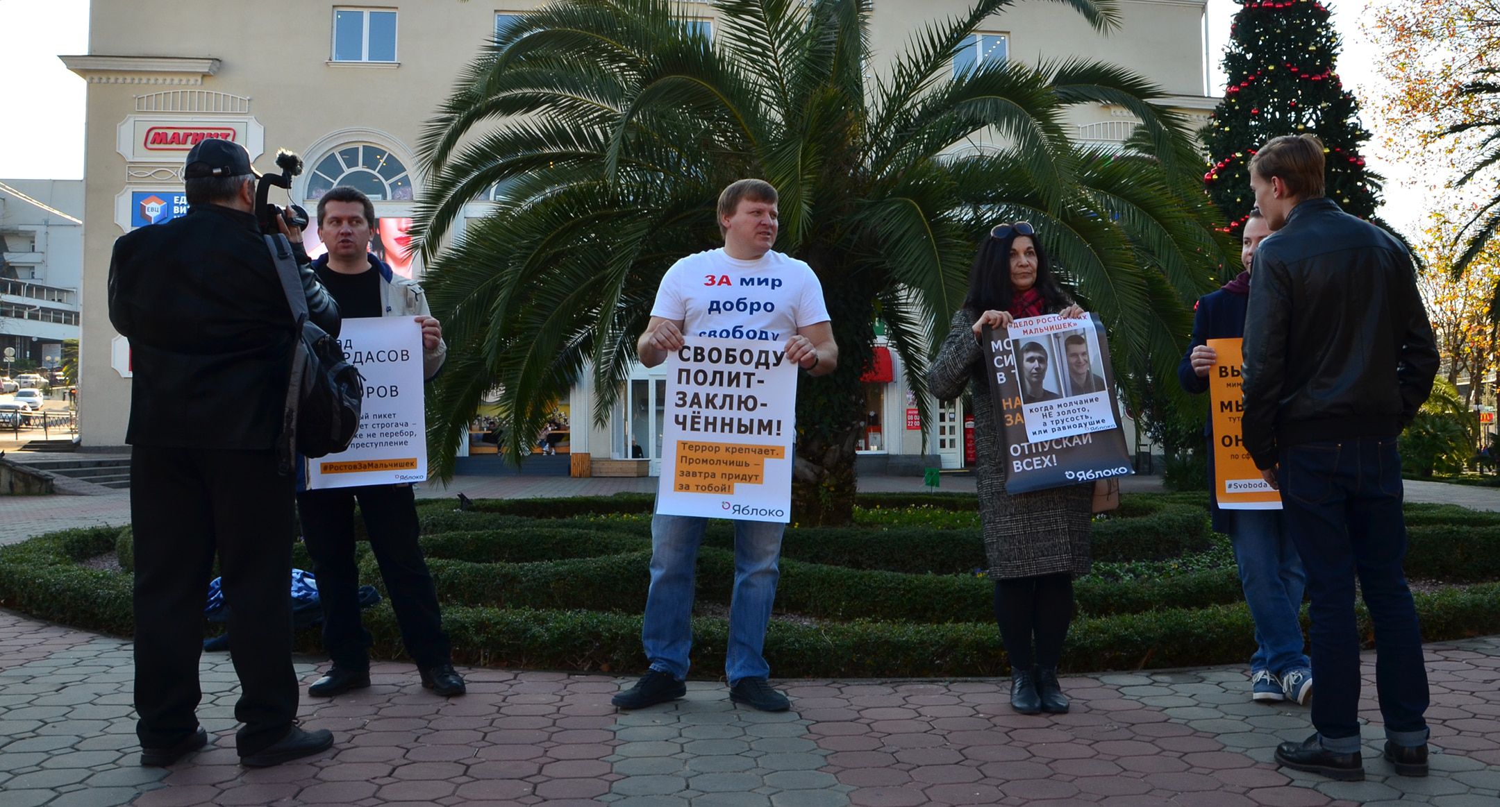 Четверо членов партии "Яблоко" 12 декабря с 12 до 14 часов в центре Сочи в сквере ЦУМа напротив железнодорожного вокзала провели согласованный с властями пикет в защиту осужденных Владислава Мордасова и Яна Сидорова.
