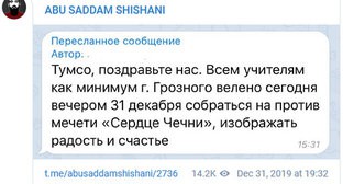 Работники школ в Грозном сообщили 31 декабря, что их вынуждают участвовать в новогодних торжествах, следует из публикации блогера Тумсо Абдурахманова в Telegram. "Тумсо, поздравьте нас. Всем учителям как минимум г. Грозного велено сегодня вечером 31 декабря собраться напротив мечети "Сердце Чечни", изображать радость и счастье", - говорится в сообщении.