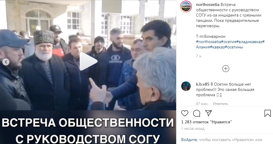 Видео со «встречи общественности с руководством СОГУ из-за инцидента с грязными танцами» опубликовано сегодня в паблике «northossetia» в Instagram. На нем претензии к представителям вуза предъявляют несколько человек, среди которых пожилой мужчина с седой бородой в папахе и молодой, крепкого телосложения мужчина в кожаной бейсболке.