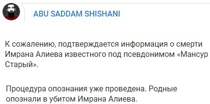Смерть Алиева подтвердил Тумсо Абдурахманов. Полиция провела процедуру опознания, и родные подтвердили, что найдено тело выходца из Чечни Имрана Алиева, также известного как Мансур Старый, сообщил Тумсо в своем Telegram-канале.