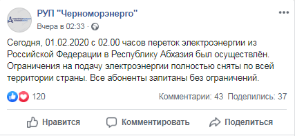 Переток электроэнергии из России в Абхазию был осуществлён 1 февраля с 02.00 часов (местное время совпадает с московским), сообщила в своем аккаунте в соцсети Facebook компания "Черноморэнерго". "Ограничения на подачу электроэнергии полностью сняты по всей территории страны. Все абоненты запитаны без ограничений", - говорится в сообщении.