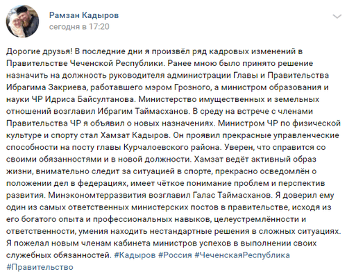 Как писал "Кавказский узел", в феврале Рамзан Кадыров произвел ряд кадровых перестановок в правительстве Чечни. 10 февраля он назначил своего племянника Ибрагима Закриева, занимавшего должность мэра Грозного, руководителем администрации главы и правительства Чечни. Ранее пост руководителя администрации главы и правительства Чечни занимал Галас Таймасханов. Депутаты гордумы Грозного поздно вечером 11 февраля объявили конкурс на должность мэра. Врио мэра был назначен первый замглавы города Иса Хаджимурадов. 4 февраля стало известно, что Рамзан Кадыров назначил министром образования своего двоюродного брата Идриса Байсултанова, до этого занимавшего должность замруководителя администрации главы республики. Педагоги в Грозном рассказали, что получили указания контролировать стиль одежды школьников после назначения Байсултанова.