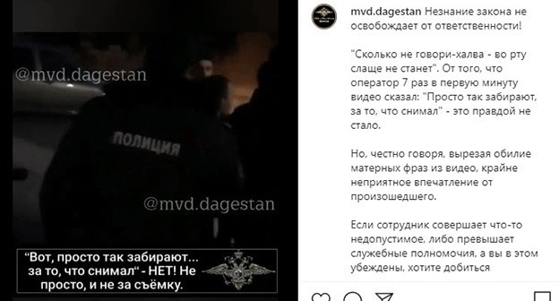 Как информировал "Кавказский узел", видео с покаянием его автора об уличном конфликте силовиков и местных жителей в Дагестане, опубликованное 1 марта, вызвало негодование у читателей дагестанских Instagram-пабликов. Пресс-служба министерства не должна была публиковать это видео, заявили они, также призвав полицейских, также использовавших нецензурную брань, к извинениям. Комментаторы отметили, что подобное поведение полицейских негативно влияет на авторитет всего ведомства.