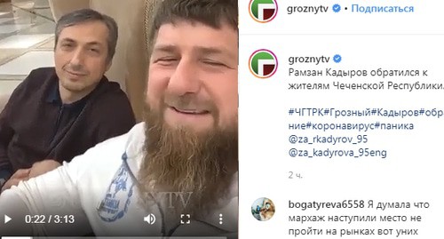 Часть обращения произносится Кадыровым на чеченском языке. "Глава региона в своем обращении посоветовал всем укреплять иммунитет, довериться воле Всевышнего и не поддаваться на провокации, а тем, кто распространяет ложную информацию и подталкивает людей на панику – придется извиниться и отвечать за свои поступки", – говорится в публикации от 16 марта в Instagram-паблике ЧГТРК "Грозный".