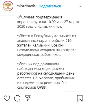 Дома под наблюдением врачей находятся 129 человек, все они прибыли из районов с неблагополучной по коронавирусу ситуацией, симптомов заболевания у них нет, сообщил 27 марта Минздрав Калмыкии на своей официальной странице в Instagram, насчитывающей 11,6 тысячи подписчиков. В инфекционную больницу Элисты госпитализировано 15 человек с симптомами вирусной инфекции, в обсервации находится один человек, в условиях изолятора на данный момент находятся 36 человек, следует из сообщения.