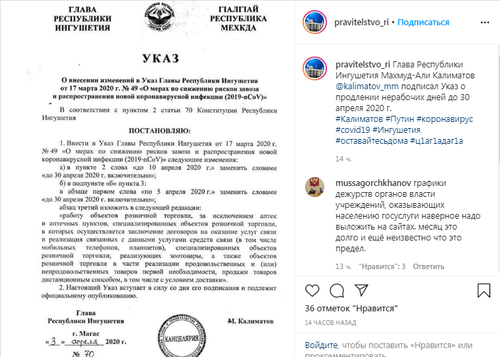 Режим самоизоляции в Ингушетии продлен, сообщается 4 апреля на официальной странице правительства республики в Instagram, насчитывающей 30,2 тысячи подписчиков. "Глава Республики Ингушетия Махмуд-Али Калиматов подписал указ о продлении нерабочих дней до 30 апреля", - говорится в сообщении, со ссылкой на указ за подписью Калиматова, копия которого  опубликована на странице в соцсети.