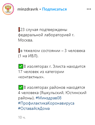 Министр здравоохранения Калмыкии Юрий Кикенов связал ухудшением эпидемиологической ситуации по коронавирусу с несоблюдением режима самоизоляции. «Мы каждый день регистрируем новые случаи заболевания коронавирусом. И не по одному. Эти очаги уже не связаны с первичным», - заявил министр в видео, размещенном 9 апреля на официальной станице Минздрава в Instagram.