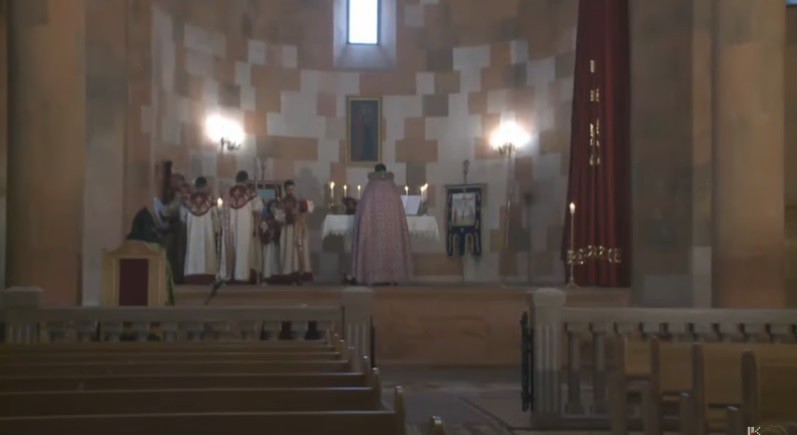 Сегодня вечером, 11 апреля, Общественное телевидение Арцаха (Нагорного Карабаха) в прямом эфире вела трансляцию вечерней литургии по случаю Сочельника из храма Покрова Божией Матери в Степанакерте. В храме находились священнослужители Арцахской (карабахской) епархии ААЦ и его предводитель архиепископ Паргев Мартиросян, и церковный хор.
