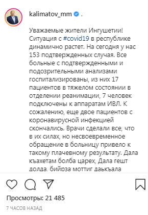 "Еще двое пациентов с коронавирусной инфекцией скончались", - написал 16 апреля глава Ингушетии Махмуд-Али Калиматов на своей странице в Instagram. По его словам, врачи не смогли помочь больным, потому что они слишком поздно обратились в больницу.