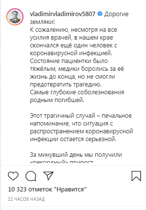 "Несмотря на все усилия врачей, в нашем крае скончался ещё один человек с коронавирусной инфекцией", - сообщил 18 апреля на своей странице в Instagram губернатор Ставропольского края Владимир Владимиров. По словам главы региона, состояние пациентки было тяжёлым, врачи не смогли ей помочь.