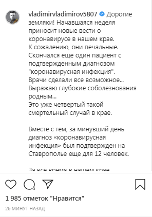 "Скончался еще один пациент с подтвержденным диагнозом коронавирусная инфекция... Это уже четвертый такой смертельный случай в крае", - сообщил сегодня на своей странице в Instagram губернатор Ставропольского края Владимир Владимиров.