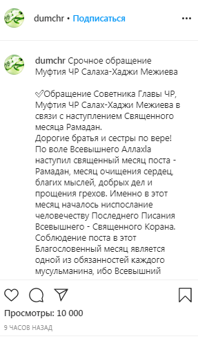 "Наступил священный месяц поста - Рамадан, месяц очищения сердец, благих мыслей, добрых дел и прощения грехов", - говорится в сообщении Межиева на официальной странице Духовного управления мусульман Чечни в Instagram, насчитывающей 114 тысяч подписчиков.