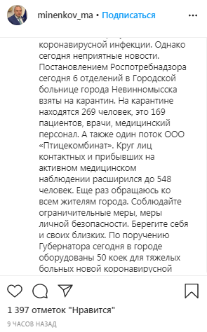 "Постановлением Роспотребнадзора сегодня шесть отделений в городской больнице города Невинномысска взяты на карантин", - написал сегодня на своей странице в Instagram мэр Михаил Миненков.