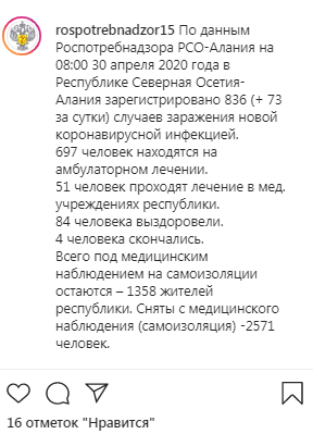 В Северной Осетии заражение коронавирусом выявлено еще у 73 человек, после чего общее число инфицированных составило 836, сообщило 30 апреля управление Роспотребнадзора по Северной Осетии на официальной странице в Instagram.