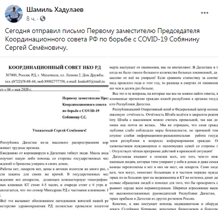 "Сегодня (6 мая) отправил письмо первому заместителю председателя Координационного совета РФ по борьбе с COVID-19 Собянину Сергей Семёновичу", - написал Шамиль Хадулаев на своей странице в Facebook.