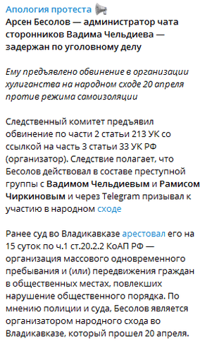 Администратор Telegram-чата Арсен Бесолов задержан по обвинению в том, что вместе с организатором несанкционированного митинга против самоизоляции во Владикавказе Вадимом Чельдиевым призывал участников чата поддержать акцию протеста.