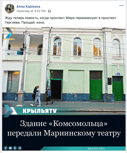 Владикавказская журналистка Анна Кабисова, которая боролась за восстановление кинотеатра, после сообщения о передаче кинотеатра Мариинке написала на своей странице в Facebook: «Жду теперь новость, когда проспект Мира переименуют в проспект Гергиева. Прощай, кино».