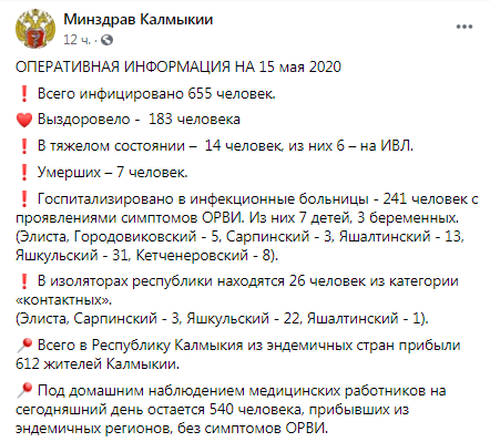 По данным на 15 мая в республике число зарегистрированных случаев заболевания коронавирусом составило 655, 183 человека выздоровели, количество умерших не изменилось – их семь, сообщил Минздрав Калмыкии на своей странице в Facebook.