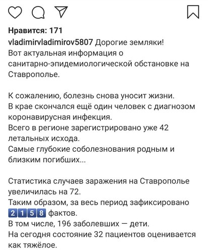 Новую информацию о текущей обстановке по коронавирусу в регионе сообщил сегодня губернатор Ставропольского края Владимир Владимиров. "В крае скончался еще один человек с диагнозом коронавирусная инфекция. Всего в регионе зарегистрировано уже 42 летальных исхода. Статистика случаев заражения на Ставрополье увеличилась на 72. Таким образом, за весь период зафиксировано 2158 фактов", – написал Владимиров на своей странице в Instagram.