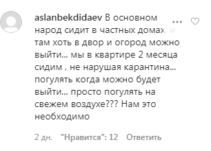 "В основном народ сидит в частных домах, и там хоть во двор и огород можно выйти. Мы в квартире два месяца сидим, не нарушая карантина. Погулять когда можно будет выйти? Просто погулять на свежем воздухе??? Нам это необходимо", – написал aslanbekdidaev.
