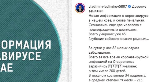 Губернатор Ставропольского края Владимир Владимиров сообщил о ситуации по коронавирусу в регионе за последние сутки. "Новая информация о коронавирусе в нашем крае и снова печальная. Скончались еще два человека с подтвержденным диагнозом. Всего умерших уже 45. За сутки у нас 82 новых случая заболевания", – написал Владимиров сегодня на своей странице в Instagram.