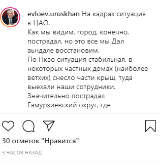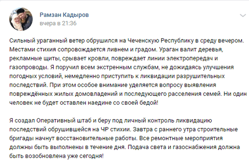 "Я поручил всем экстренным службам, не дожидаясь улучшения погодных условий, немедленно приступить к ликвидации разрушительных последствий. При этом особое внимание уделяется вопросу выявления повреждённых жилых домовладений и последующего расселения семей", – написал на своей странице "ВКонтакте" Кадыров. Строительные бригады начнут восстановительные работы с утра 4 июня, отметил он.