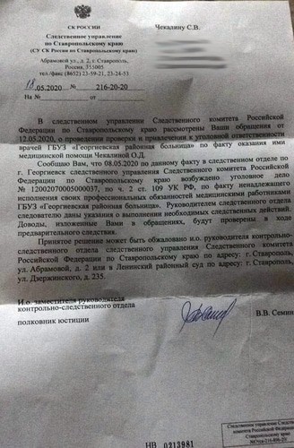 И действительно, к этому времени в отделении реанимации были устранены почти все недостатки, о которых написал в начале мая Василий Васильевич. [...] Активность в устранении нарушений и долгов он связывает с уголовным делом [...]. Уголовное дело по ч. 2 ст. 109 УК по факту смерти больной Чекалиной возбудили 8 мая.