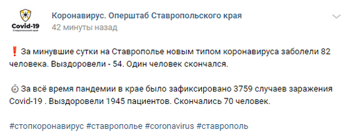 За прошедшие сутки скончался один пациент с коронавирусом, общее число смертей зараженных COVID-19 возросло до 70, сообщил сегодня губернатор Ставропольского края Владимир Владимиров на своей странице в Instagram.