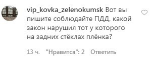"Вот вы пишите соблюдайте ПДД. Какой закон нарушил тот, у кого на задних стёклах плёнка?" задается вопросом в комментариях на странице Черхигова пользователь под ником vip_kovka_zelenokumsk. "Никакого законного права не имеют они снимать плёнку", пишет он далее.