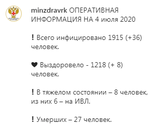 С начала пандемии в республике зарегистрировано 1915 случаев инфицирования коронавирусом, 36 из них выявлено за последние сутки, выздоровело 1218 заболевших, сообщил 4 июля Минздрав Калмыкии на своей странице в Instagram. По данным ведомства, в тяжелом состоянии находятся восемь человек, из них шесть подключены к аппаратам искусственной вентиляции легких.
