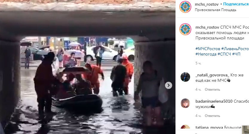 На странице областного управления МЧС в Instagram сегодня опубликованы два видео, записанные на Привокзальной площади в Ростове-на-Дону. На одном из них показан сотрудник ведомства, раскладывающий на асфальте шланги для откачки воды. На затопленной улице пять таких шлангов. На другом видео спасатели, идущие через затопленный участок вброд, буксируют надувную лодку, в которой сидит семья с ребенком.