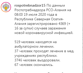 Общее число заражений, по данным ведомства, на 19 июля составило 4369, 67 человек скончались, 519 человек находятся на амбулаторном лечении, 37 человек проходят лечение в стационарах, 3746 человек выздоровели.