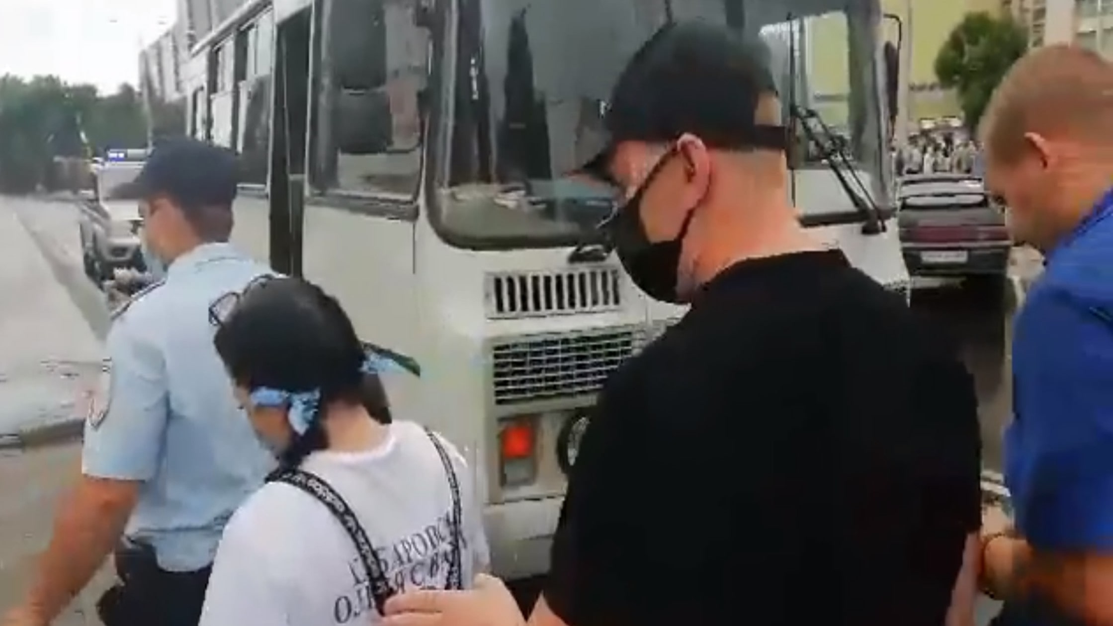 На видео, опубликованном сегодня изданием, люди в штатском заводят в автозак Крахмалеву в футболке с надписью "Хабаровск, Олеся с вами". Сопровождающие активистку люди требуют объяснить причины задержания и представиться, но их игнорируют.