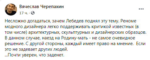 "Несложно догадаться, зачем Лебедев поднял эту тему. Реноме модного дизайнера легко поддерживать критикой известных (в том числе) архитектурных, скульптурных и дизайнерских образцов. В данном случае наезд на "Родину-мать" - не самое очевидное решение. С другой стороны, каждый имеет право на мнение. Если это не задевает других людей... Почти уверен, что заденет", - написал на своей странице в Facebook Вячеслав Черпахин.