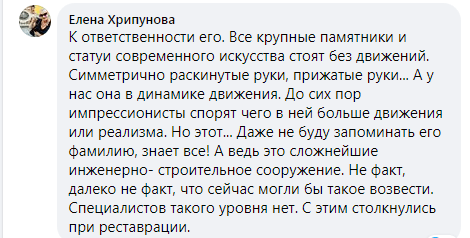 "К ответственности его (Лебедева). Все крупные памятники и статуи современного искусства стоят без движений. Симметрично раскинутые руки, прижатые руки. А у нас она в динамике движения... А ведь это сложнейшее инженерно-строительное сооружение. Не факт, далеко не факт, что сейчас могли бы такое возвести. Специалистов такого уровня нет. С этим столкнулись при реставрации", - высказалась Елена Хрипунова.