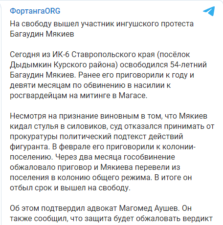 Активист Багаудин Мякиев, осужденный за нападение на силовиков на митинге в Магасе, отбыл срок наказания в ставропольской колонии.