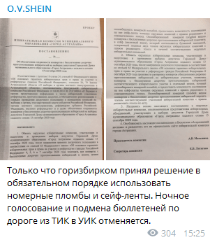 "Горизбирком принял решение в обязательном порядке использовать номерные пломбы и сейф-ленты. Ночное голосование и подмена бюллетеней по дороге из ТИК в УИК отменяется", - сообщил в своем Telegram-канале депутат Госдумы Олег Шеин, приложив копии постановления избирательной комиссии Астрахани.