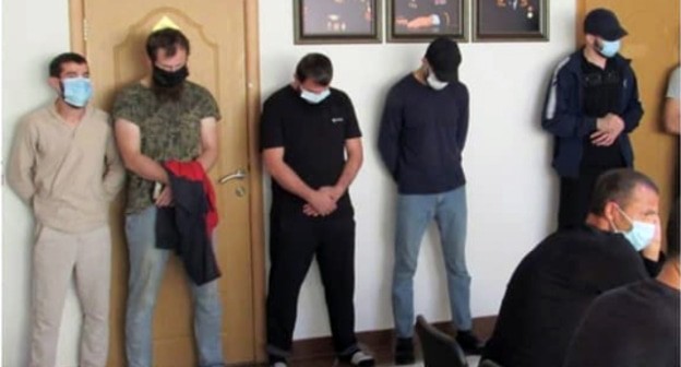 На фотографии видно около 10 мужчин в защитных масках, которые стоят у стены. Некоторые из них опустили головы. За столом сидят несколько человек в гражданском, а также офицеры полиции в форме.