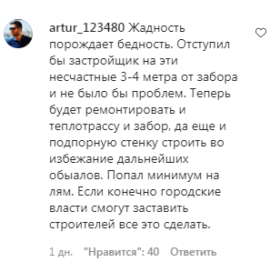 "Отступил бы застройщик на эти несчастные три-четыре метра от забора, и не было бы проблем. Теперь будет ремонтировать и теплотрассу, и забор, да еще и подпорную стенку строить во избежание дальнейших обвалов. Попал минимум на лям. Если, конечно, городские власти смогут заставить строителей все это сделать", - отметил artur_123480.