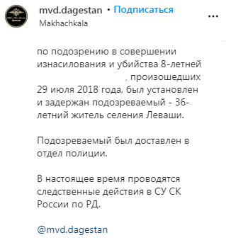 "По подозрению в совершении изнасилования и убийства восьмилетней [девочки] 29 июля 2018 года был установлен и задержан подозреваемый - 36-летний житель селения Леваши", - сообщило 18 октября МВД по Дагестану на своей странице в Instagram. Подозреваемого доставили в отдел полиции, отмечает ведомство.